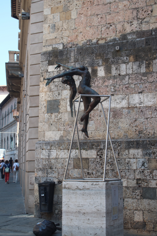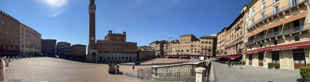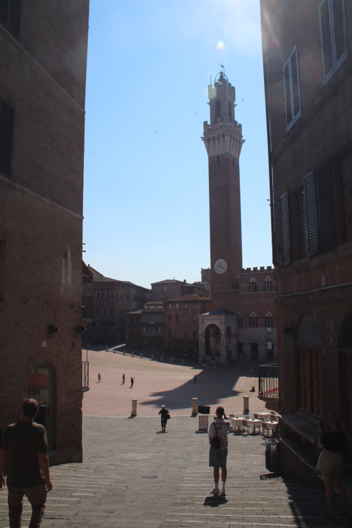 Nur wenige Minuten vom Parkplatz geht es durch ein Stadttor in die Altstadt von Siena und gleich steil bergauf. Siena ist ganz anders aufgebaut als die Orte, die wir vorher besichtigt hatten. Enge Gassen und mehrstöckige Häuser prägen hier das Stadtbild. Leider fahren durch die Gässchen auch noch Autos, so dass ein gemütliches Schlendern oft nicht möglich ist. Natürlich werden an den Hauptattraktionen, dem Piazza del Campo und dem Dom von Siena die üblichen Fotos geschossen, aber hauptsächlich lassen wir uns durch die Gassen treiben. Im Schatten des Doms genießen wir einen leckeren Cappuccino, ehe wir uns auf den Rückweg zum Globi machen. Während ich so auf dem Handy nach dem richtigen Weg suche, läuft doch tatsächlich meinen Frauen die derzeit wohl bekannteste Einwohnerin von Siena – Gianna Nannini – über den Weg. Für ein Foto hat es nicht gereicht und ich war sauer, dass sie mir nicht rechtzeitig Bescheid gesagt haben, hatte ich doch noch am morgen gesagt, dass sie aus Siena stammt! Wieder mal blöd gelaufen!